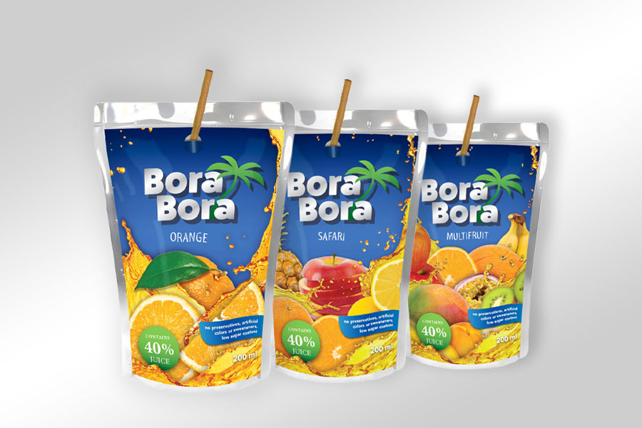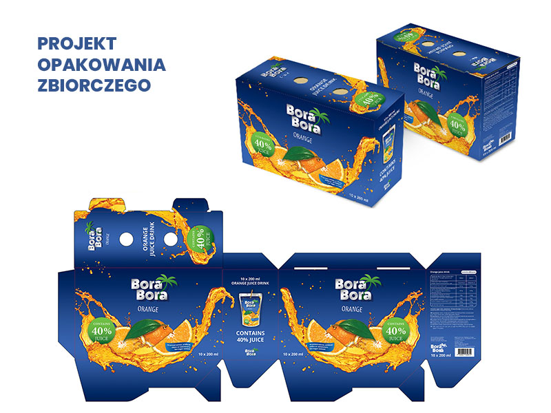 Zlecenie zakładało: przygotowanie logo, opracowanie projektów woreczków i opakowań zbiorczych dla trzech smaków napoju, stworzenie wizualizacji projektów oraz przygotowanie ich do druku.