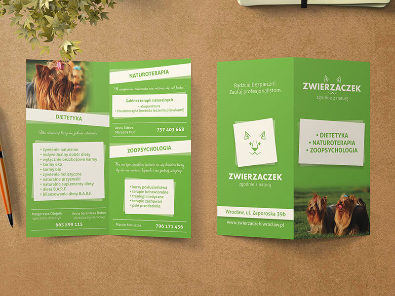 Po wspólnym opracowaniu przez naszą agencję logo (opartym na stworzonym przeze mnie pyszczku, który stał się nowym symbolem Zwierzaczka) zająłem się realizacją zlecenia – przygotowaniem m.in.: wizytówek, ulotek, papieru firmowego oraz odświeżeniem sklepowych witryn.